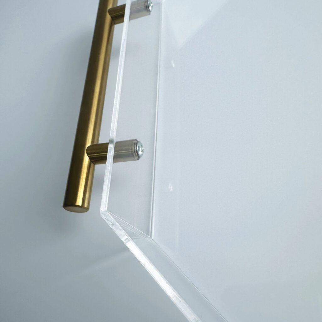 O corpo do tabuleiro é construído a partir de uma única peça de acrílico de alta qualidade, abrilhantado até obter um revestimento perfeito e cristalino. Esta opção de material utiliza a excelente transparência do vidro sem a sua fragilidade e peso. O resultado é um tabuleiro duradouro e leve, que é simultaneamente bonito e útil. A sua qualidade “quase inexistente” permite que a estrutura e a tonalidade da superfície subjacente - seja ela uma madeira rica, um mármore espantoso ou uma roupa de cama de mesa - sejam visíveis, evitando a confusão visual. Os artigos que coloca no interior flutuam, as suas cores e tipos são realçados, transformando uma coleção básica de produtos numa vinheta elegante.